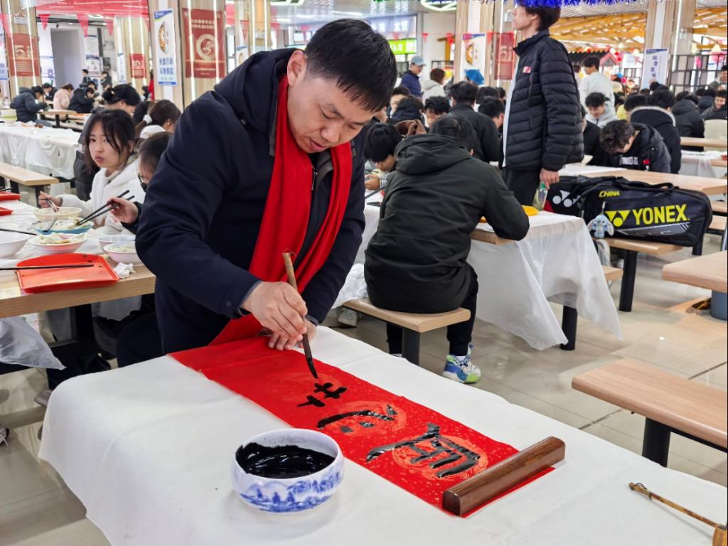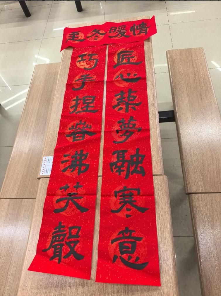 活动尾声,建筑与水利工程学院学生工作负责人卢克斌挥毫写下对联:“匠心筑梦融寒意,巧手捏春沸笑声”,横批“情暖冬至”。这幅对联笔力遒劲、意蕴深厚,既融入了建筑与水利的专业特色,又寄寓了立德树人、服务社会的教育使命,吸引师生驻足欣赏,为冬至增添了浓郁的文化气息。