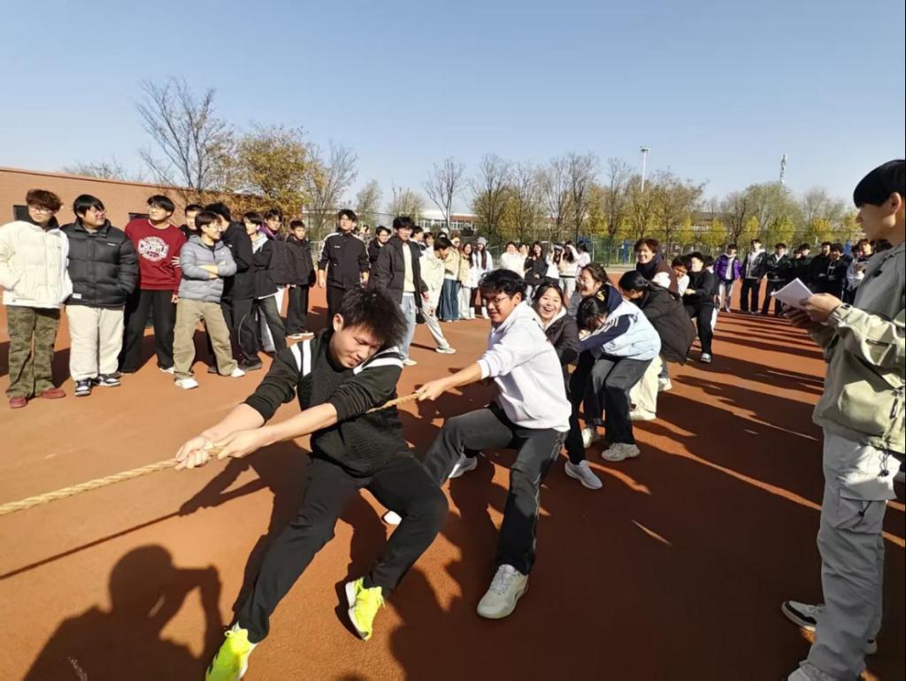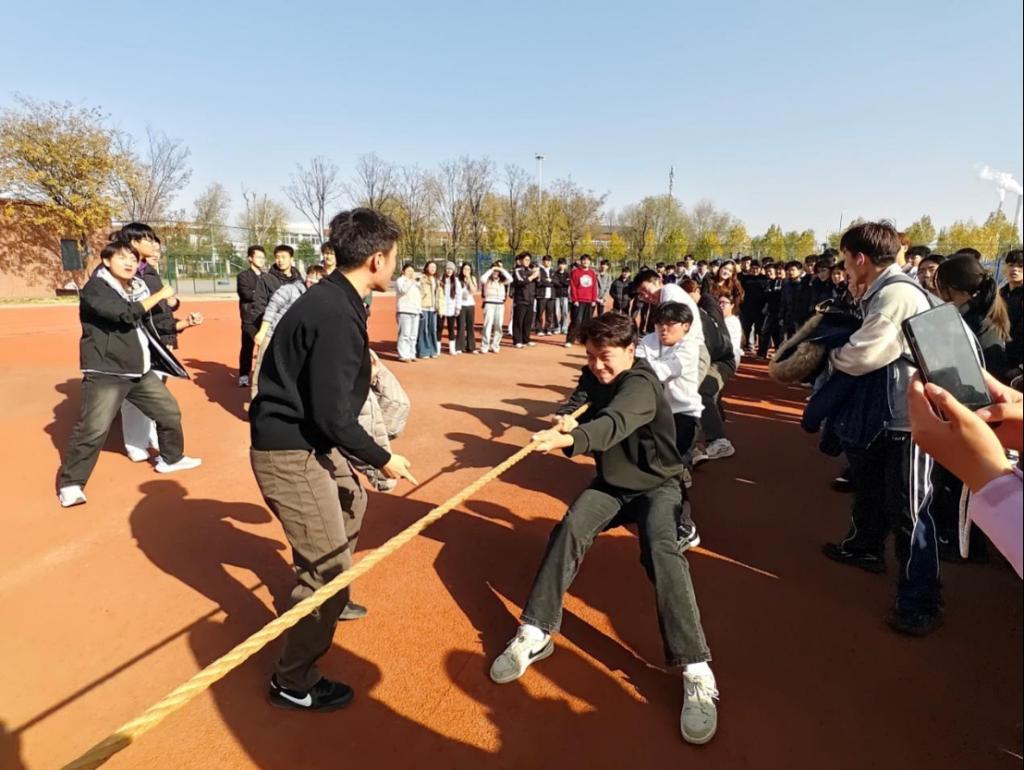 比赛开始前,各班级代表队便早早来到场地,进行战术商讨和热身准备,队员们个个摩拳擦掌,斗志昂扬。随着裁判一声哨响,整个南操场瞬间被激情点燃。赛场上,参赛队员们紧握长绳,马步下蹲,身体后倾,齐声高呼着口号,将全身力量灌注于一根绳索之上。长绳中点的红标记带在双方僵持中来回移动,每一次拉锯都牵动着所有人的心。