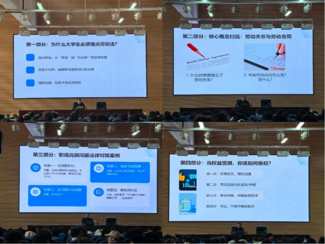 讲座内容紧密结合学生成长需求与专业特点,从我国法律体系整体框架出发,重点解读了与大学生密切相关的《劳动法》《劳动合同法》,助力学生树立职场权益保护意识;通过《民法典》合同编相关内容,深入剖析建设工程施工合同的关键条款与风险防范,提升学生在未来工程实践中的法律运用能力;同时,结合刑法典型案例开展警示教育,引导学生筑牢职业伦理底线,自觉远离违法犯罪。