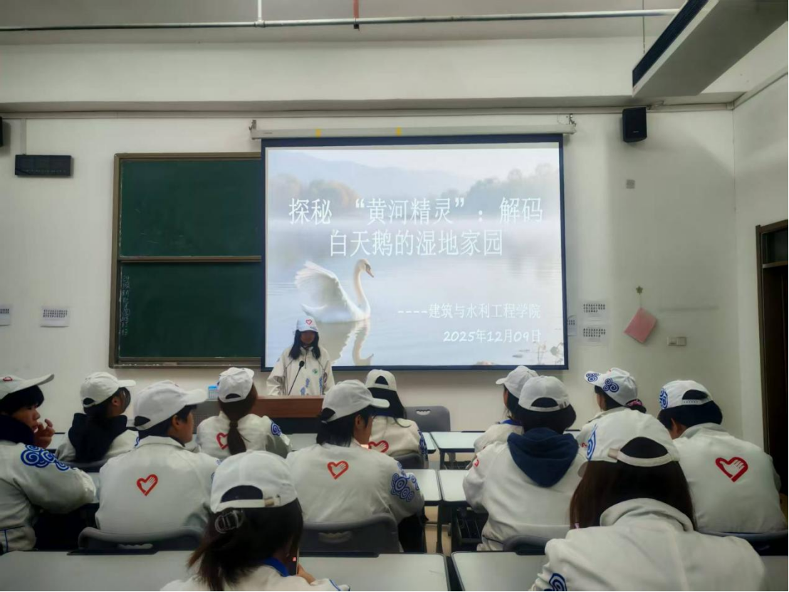为增强学生生态保护意识,推动“守护白天鹅·共筑生态城”主题月活动走深走实,建筑与水利工程学院于12月9日在81409教室举办“探秘‘黄河精灵’:解码白天鹅的湿地家园”主题科普活动,吸引了2025级全体同学积极参与。