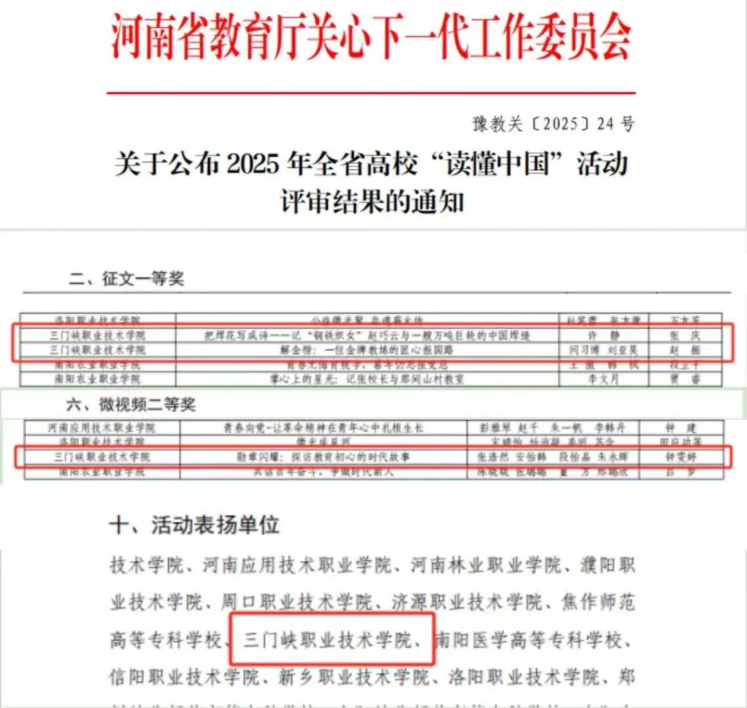 近日,河南省教育厅关心下一代工作委员会公布2025年“读懂中国”活动评审结果。建筑与水利工程学院钟雯婷老师指导学生张浩然、安怡韩、段怡品、朱永辉创作的微视频《勋章闪耀:探访教育初心的时代故事》凭借鲜明的主题立意、细腻的叙事表达和精良的制作水准,脱颖而出,荣获微视频组二等奖,为学院赢得了荣誉,也彰显了球王会体育平台网页“大思政课”实践育人的扎实成效。
