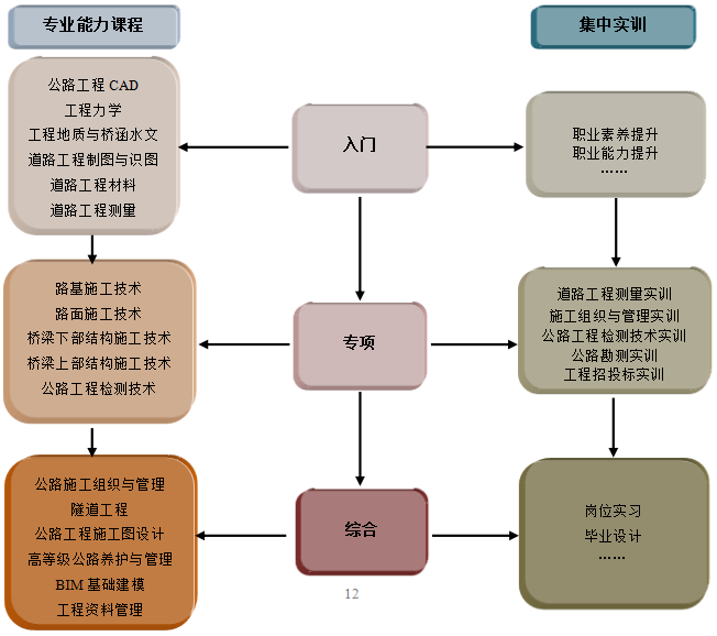 (三)专业实践课程:公路施工组织与管理实训、道路工程测量实训、公路工程检测技术实训、公路勘测实训、工程招投标实训、职业素养提升、职业能力提升、岗位实习、毕业设计。